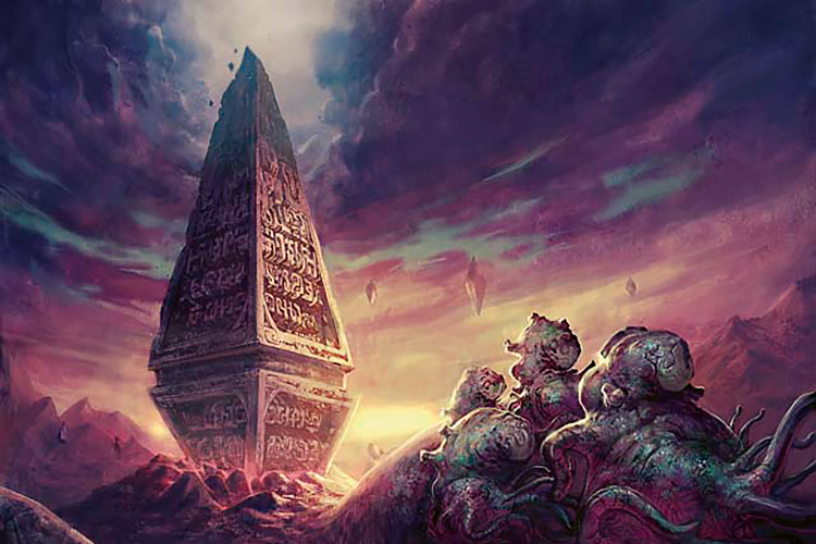 The winner of the bunch is the Kozilek lineage, whose spawn appear in the art of Kozilek's Predator, Dread Drone, Corpsehatch, Rapacious One, and Spawning Breath. Although the Kozilek-lineage Eldrazi Spawn token shows off the characteristic branching limbs and strangely placed eyes of its lineage, the spawn in the art of Essence Feed have the wing-like obsidian structures that are also an identifying mark of the Kozilek lineage.