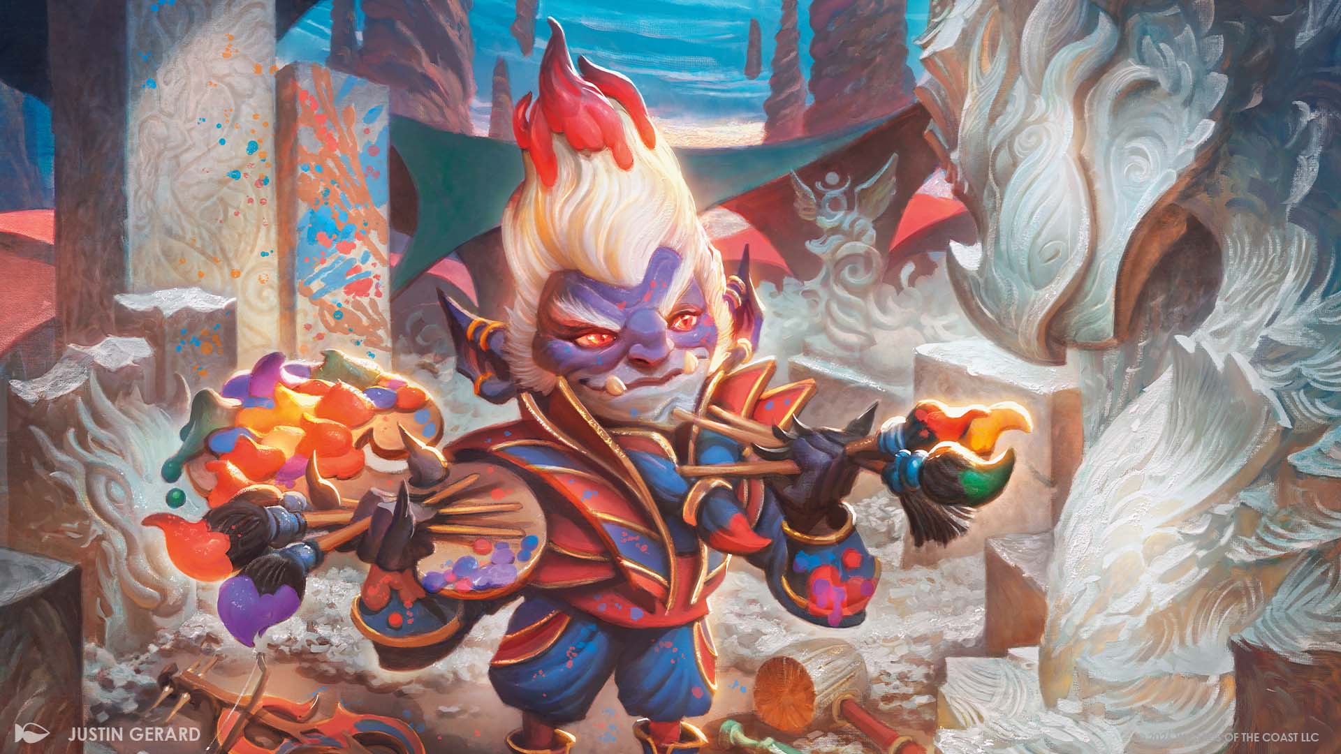 That's part of the lesson I'm learning at the Forum of Amity. Diplomats here come from all sorts of places—yet the divisions aren't so clear as they are between the colleges of Strixhaven. Within these halls, colors don't signify color so much as personal taste. I've always heard Prismari talk about the beauty of fashions and the stories contained therein, but until now I never really thought about it. Local fibers and dyes are used in the construction of an ambassador's garments. Before any of the diplomats speak, you can often deduce their home if you learned enough about textiles.