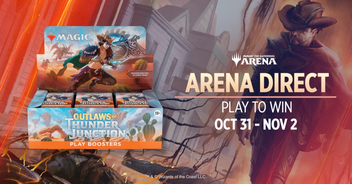 Sharpen your spurs and practice your steeliest gaze, because the next Arena Direct is days away! Arena Directs are events that allow MTG Arena players to compete to win physical Magic: The Gathering cards. From October 31–November 2, competitors will play Outlaws of Thunder Junction Sealed. In addition to MTG Arena gems and packs, players can win Outlaws of Thunder Junction Play Booster boxes!