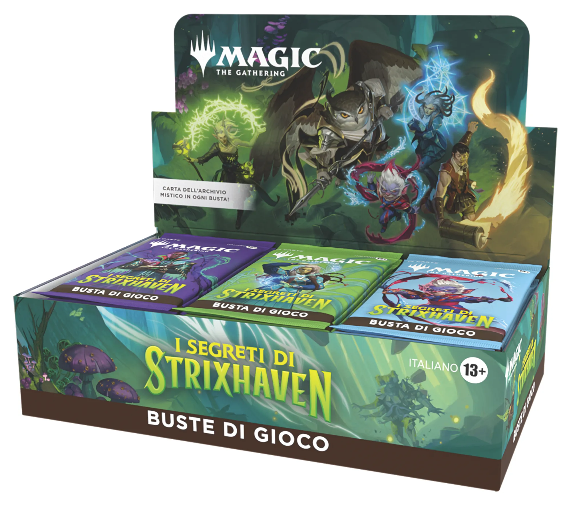 I Segreti di Strixhaven include 65 carte dell’Archivio Mistico, di cui 25 non comuni, 25 rare e 15 rare mitiche. Le buste di gioco non in giapponese e il 66,6% delle buste di gioco in giapponese contengono almeno 1 carta dell’Archivio Mistico non foil. I Collector Booster in tutte le lingue includono almeno 3 carte dell’Archivio Mistico. Le carte non foil e foil dell’Archivio Mistico possono comparire nelle buste di gioco e nei Collector Booster.