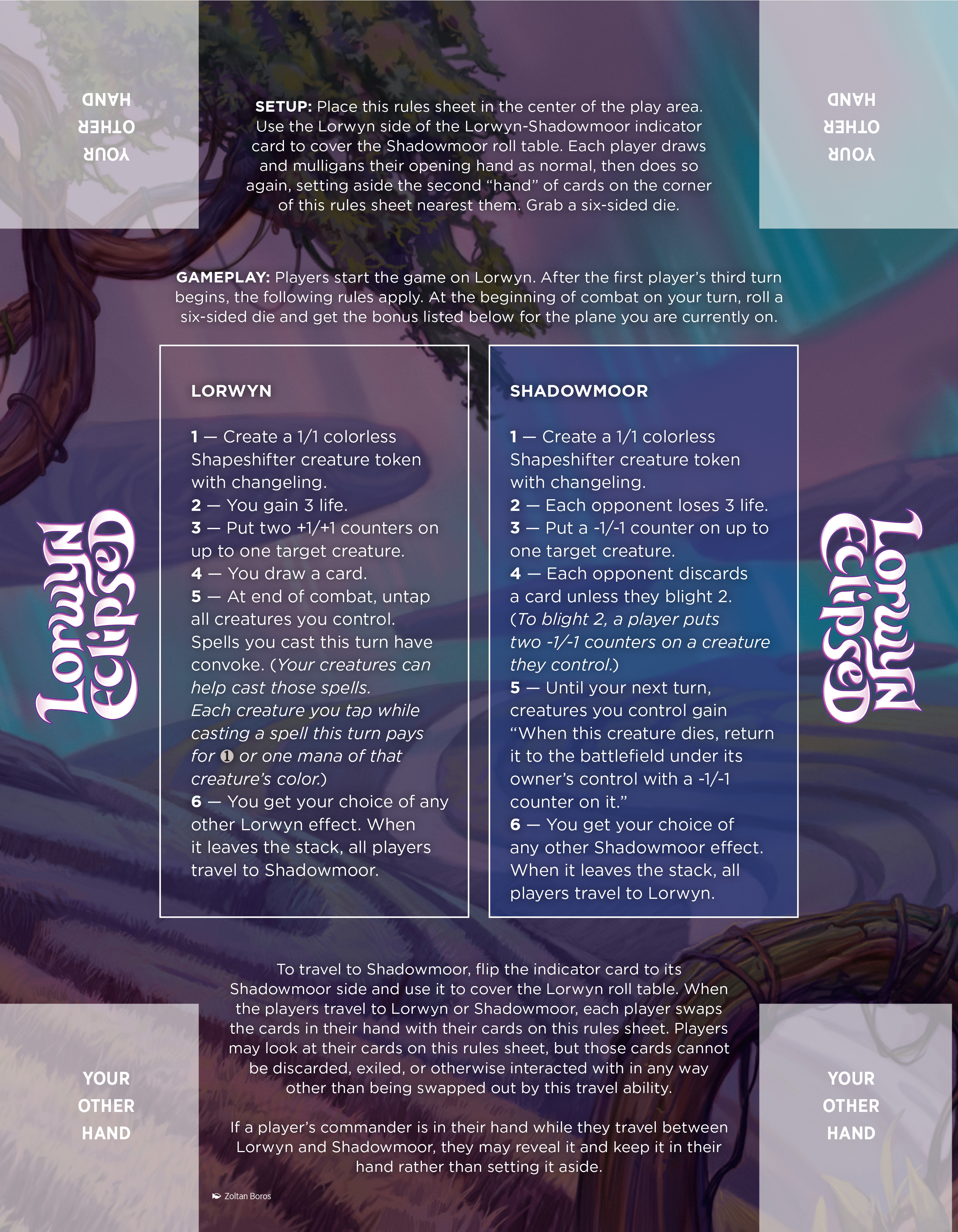 Non stai solo combattendo contro i tuoi tre avversari, ma anche contro la natura frenetica del piano. La partita avrà inizio in Lorwyn. E man mano che il gioco procede, lancerai i dadi per attivare effetti caotici e passare da Lorwyn a Landa Tenebrosa (e viceversa). Quando passi a un aspetto diverso del piano, passerai anche a una mano di carte completamente differente. Dopotutto, trasformarsi nella propria versione di Lorwyn o Landa Tenebrosa spesso significa perdere la propria memoria.